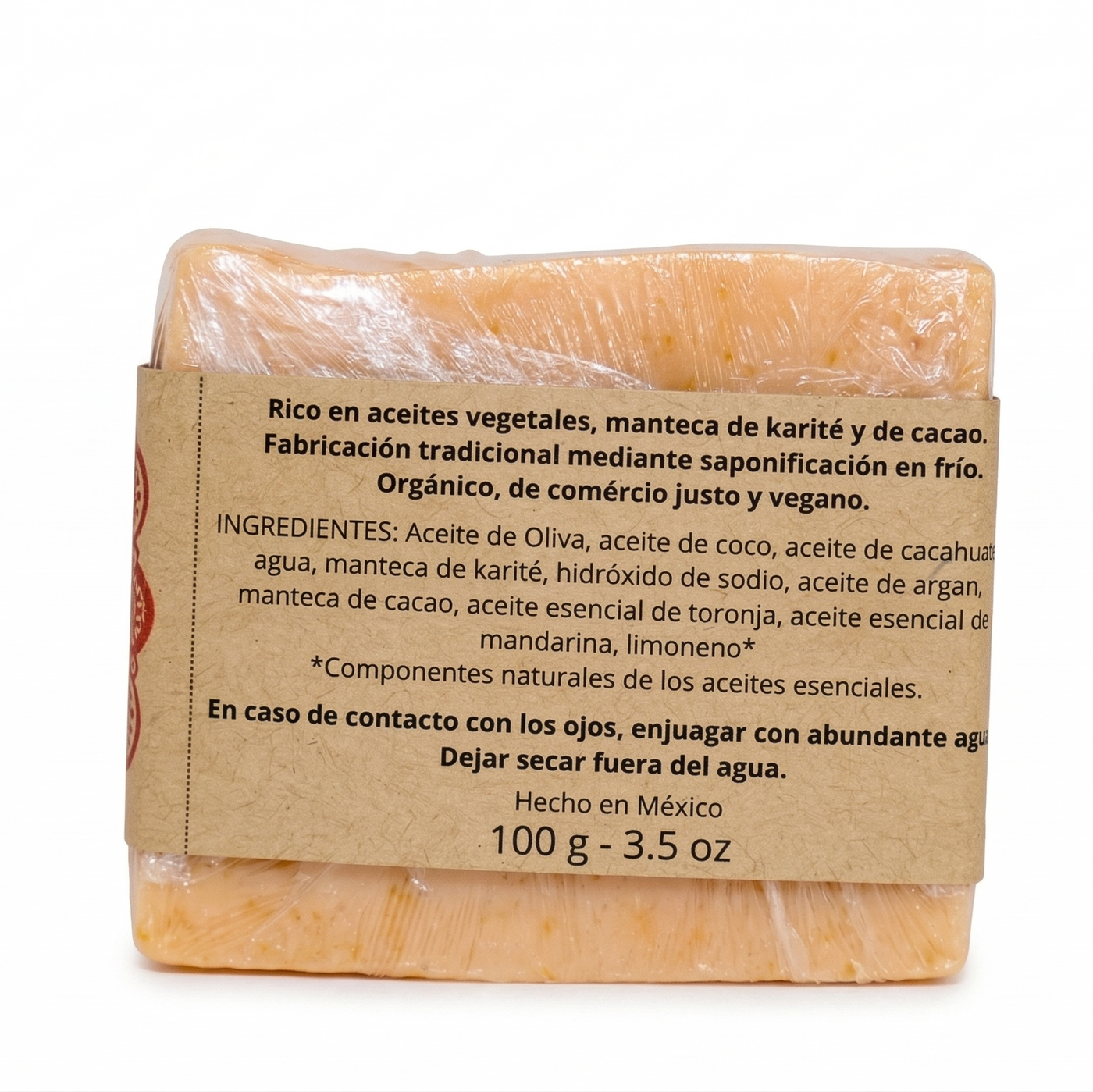INGREDIENTES: Aceite de Oliva, aceite de coco, aceite de cacahuate, agua, manteca de karité, hidróxido de sodio, aceite de argan, manteca de cacao, aceite esencial de toronja, aceite esencial de mandarina, limoneno*