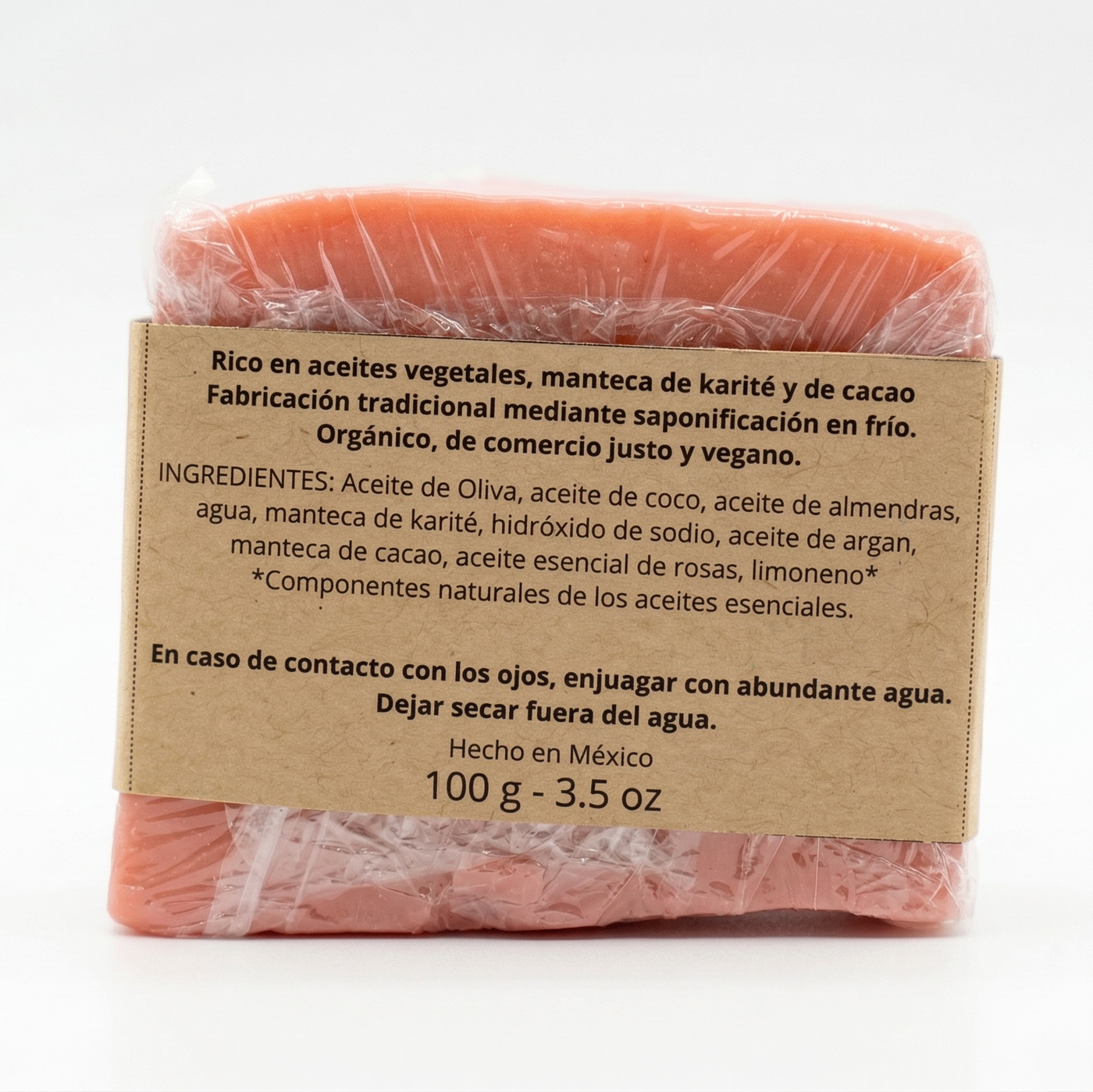 Ingredientes: Aceite de Oliva, aceite de coco, aceite de almendras, agua, manteca de karité, hidróxido de sodio, aceite de argan, manteca de cacao, aceite esencial de rosas, limoneno*